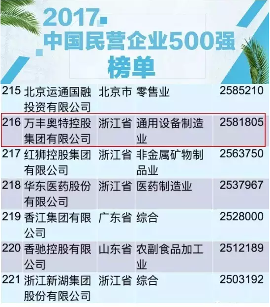 秋色染長空,齊魯傳捷報!8月24日,由全國工商聯主辦的“2017中國民營企業500強發布暨民營經濟發展峰會”在濟南召開,這不僅是一次民營企業500強的風采展示會,更是弘揚企業家精神,提振企業發展信心的盛會。會上,全國工商聯權威發布了2017“中國民營企業500強”榜單,萬豐奧特控股集團再次蟬聯500強位列216位,同時榮列“中國民企制造業500強”第128位。