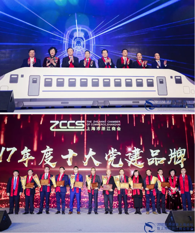 商會(huì)黨委陳愛(ài)蓮書(shū)記與郭廣昌會(huì)長(zhǎng)等見(jiàn)證了上海市浙江商會(huì)輪值會(huì)長(zhǎng)的交接儀式,共同啟動(dòng)浙商助力長(zhǎng)三角大交通一體化發(fā)展平臺(tái),并為十大黨建品牌頒獎(jiǎng)。