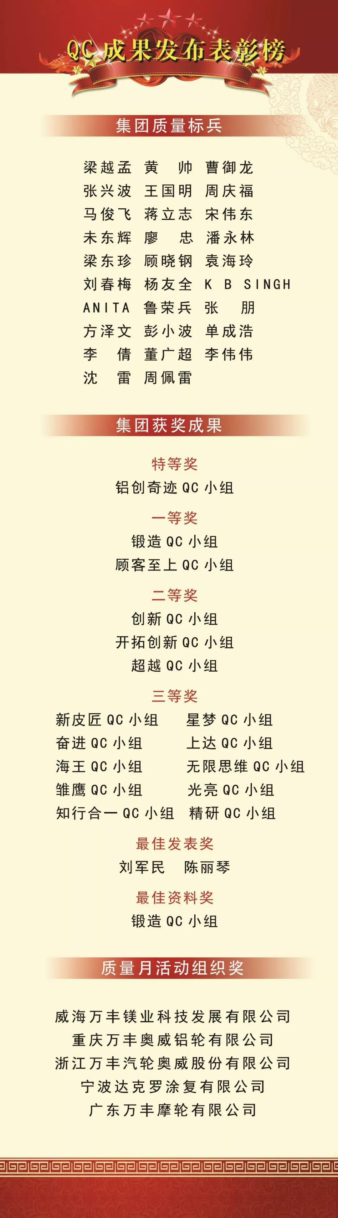 本次發布的QC成果選題鮮明、貼近實際、科學嚴謹、效果顯著,將無形、抽象的企業質量文化落到了實處,彰顯了QC小組活動對激發全員參與管理、質量改進和創新的重大意義。全體萬豐人要繼續將“專注實體經濟、弘揚工匠精神”質量精神融入崗位工作,履行“為客戶提供滿意的優質產品和服務”的使命,助力萬豐在轉型升級、提質增效中實現高質量發展。