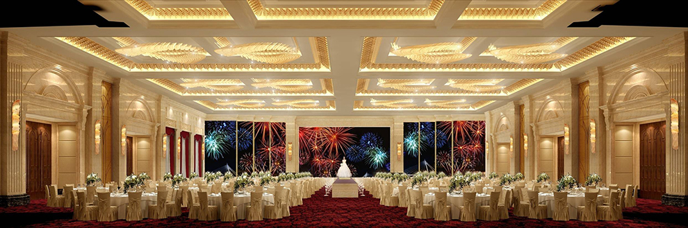 公司二樓承辦大型婚宴、各類喜宴、宴請、企事業單位年會等,為新嵊地區人民打造最稱心的宴會場所。公司宴會大廳總面積達1500平米,層高9.9米,可容納70桌大型喜宴,內置自動升降梯、大型LED屏、聲光電設備、4D影像效果,配備專業新娘化妝間、草坪婚禮等。并特邀了上海一流婚慶團隊和上海頂級餐飲團隊。